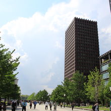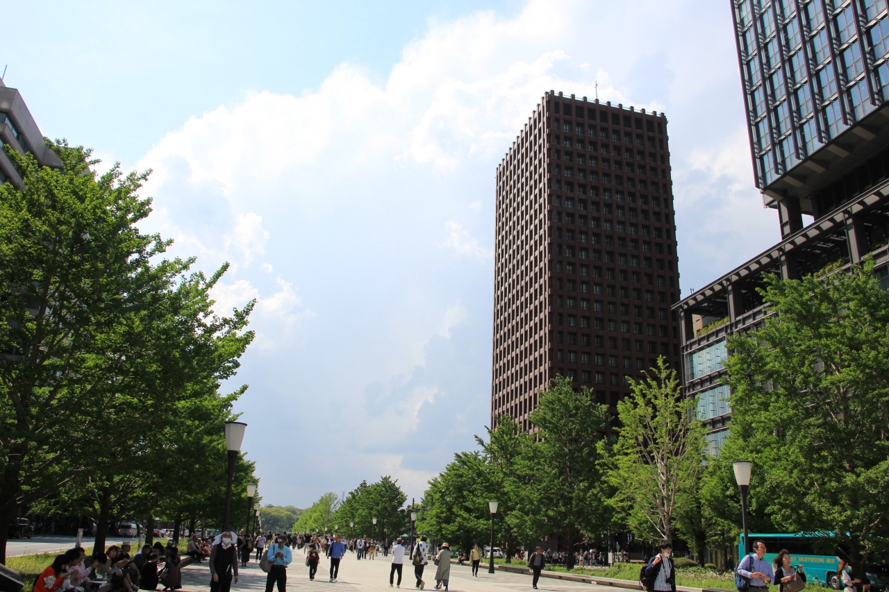 東京駅丸の駅駅舎から皇居まで真っ直ぐに延びる広い路のイチョウ並木の新緑が綺麗で良かったです。道の真ん中の歩道は車道よりも広く開放的で歩きやすくてとても良いです。