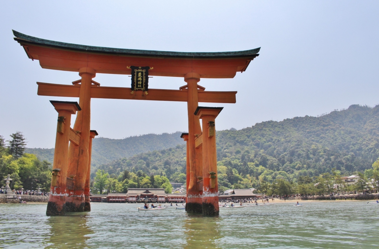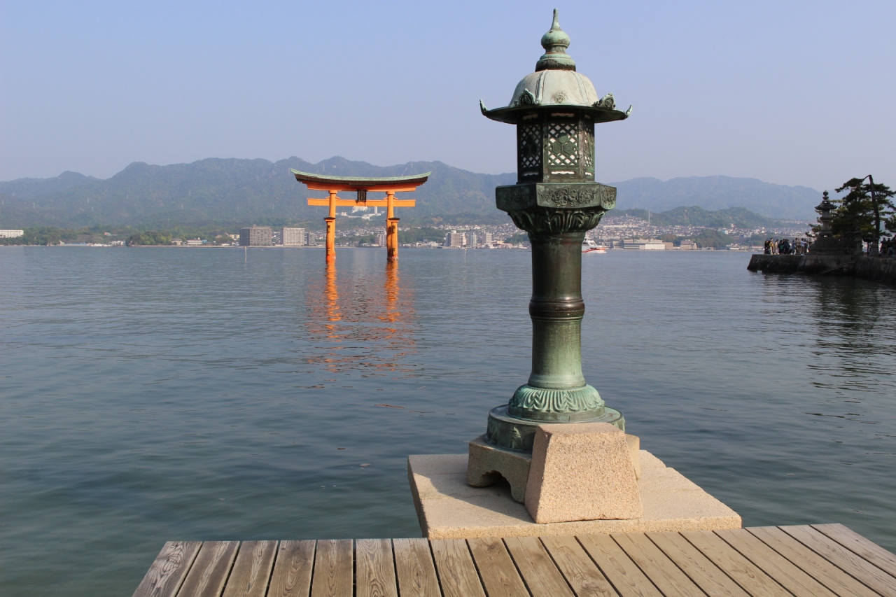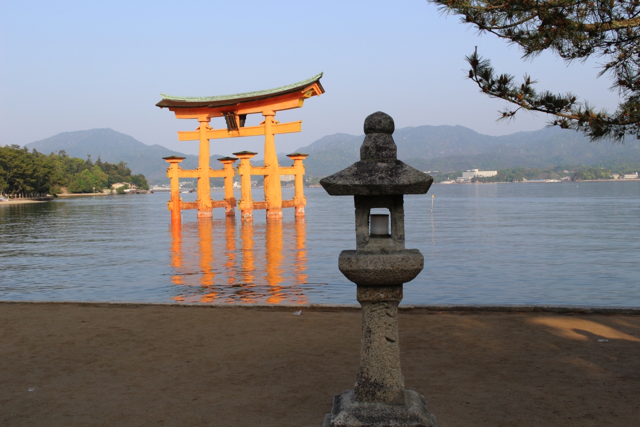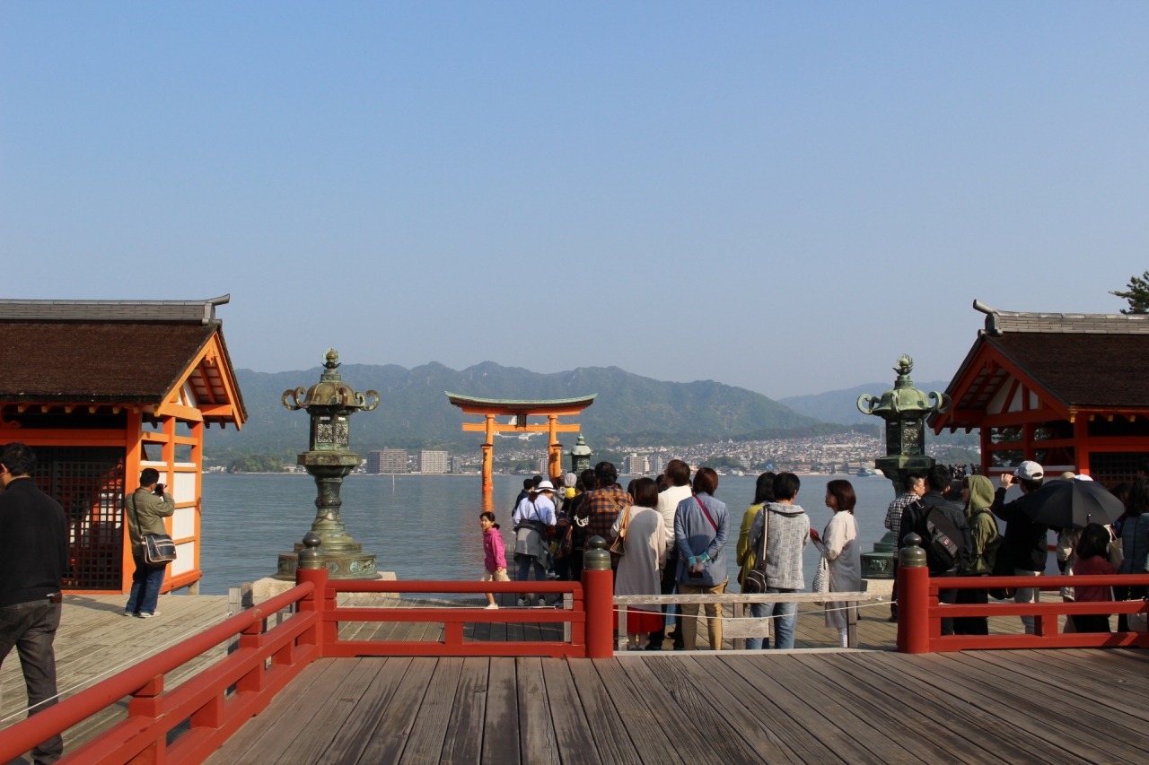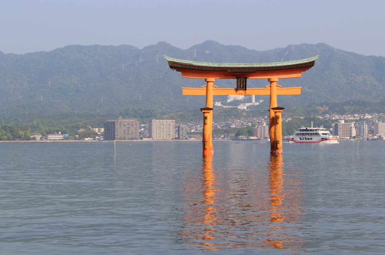 海上に浮かぶ大鳥居。かつては宮島全体が神域で、上陸する、すなわち神域を足で踏むことははばかられ、参詣には船でこの鳥居をくぐり、海上から参拝したとのこと。
