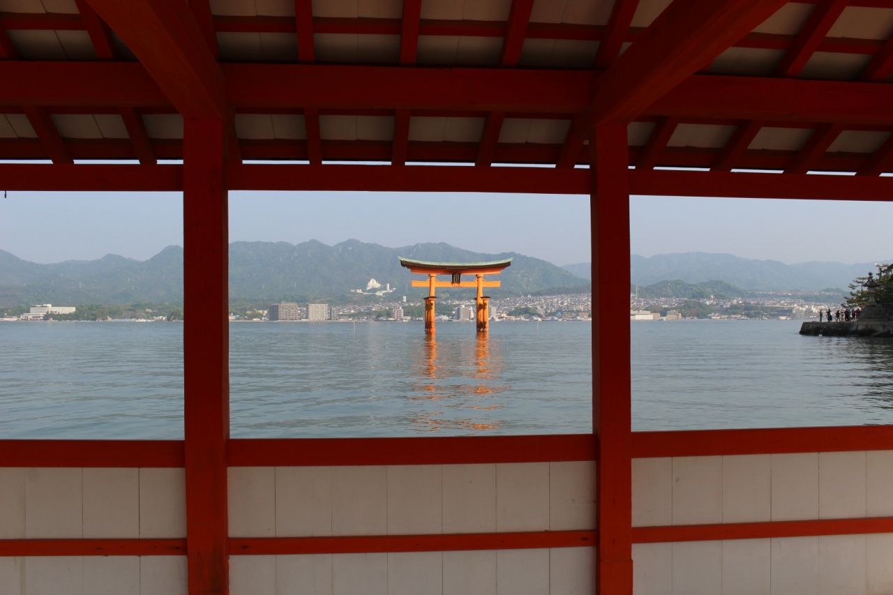 干潮時は大鳥居まで歩いて行けるようだが、満潮時であったので陸から眺めた。