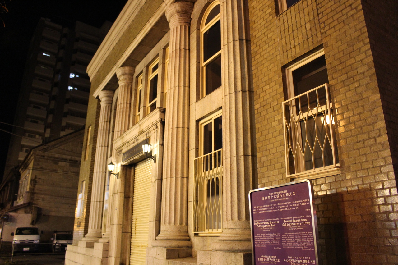 北海道の人気観光スポット、小樽市にあるスポットです。小樽市には昔、北のウォール街といわれ、銀行がたくさんありました。その当時の建物のまま残されています。ルネサンス洋式の太い柱は装飾もきれいで立派です。夜はライトアップされていて、きれいでした