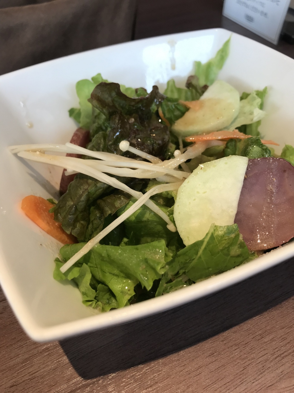 サラダはスライスしたジャガイモやえのきが入っていて目新しい。ドレッシングはゴマの風味が効いている和風寄りの味で好み。
