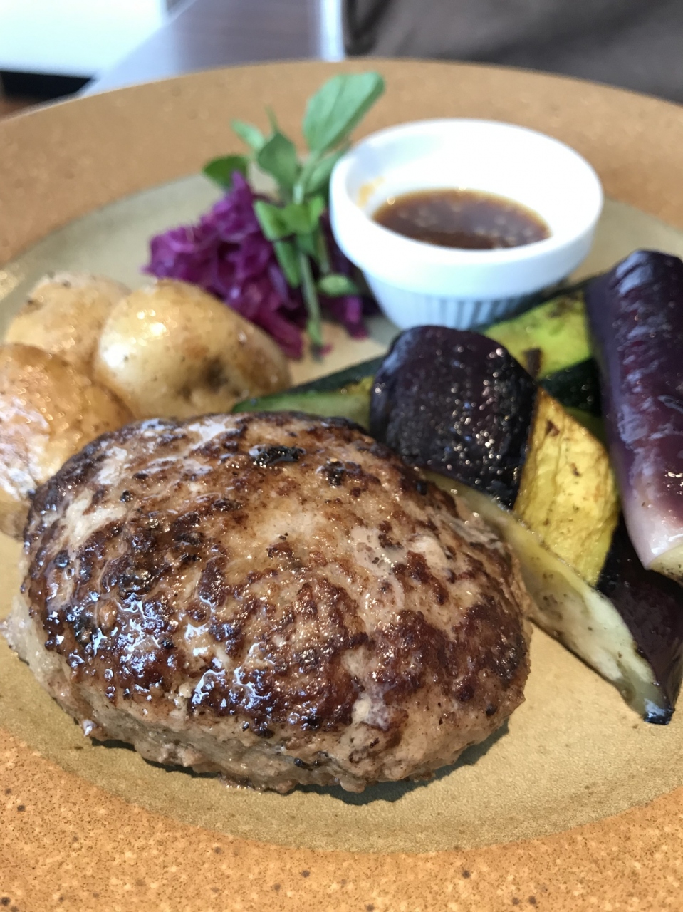 ハンバーグは120gと小ぶりですが、野菜の存在感がすごい!ジャガイモ、なす、ズッキーニがどーんとのっています。彩りも素敵。ソースをつけずに食べてみると、お肉と野菜自体が美味しいのがよく分かります。