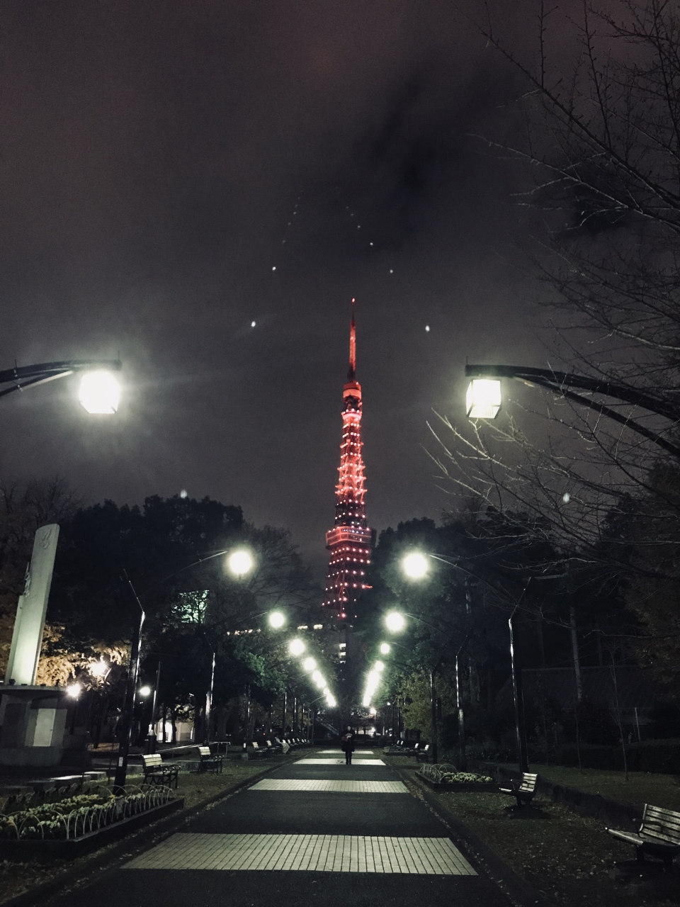 芝公園は何か所かに分かれている公園ですが、御成門駅を出てすぐの場所にある芝公園からは、公園内の通りの真正面に東京タワーが見えてきれいでした。夜景撮影スポットでもあるようで、夜景撮影をしているグループがいました。