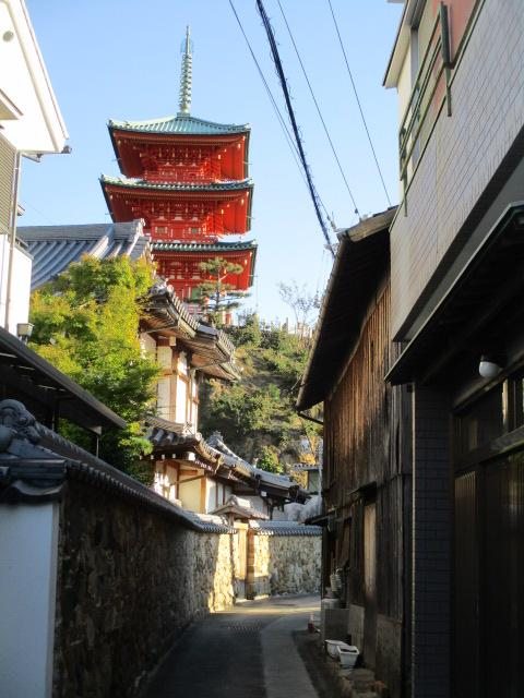 西光寺を出たくらいの場所に「迷路のまち」と書かれた看板があります。細い路地の両側に小豆島の古い家が建ち並んで、風情が抜群です。一番のスポットは、建ち並ぶ家の隙間から、西光寺の誓願の塔が見えた光景です。素晴らしいです。