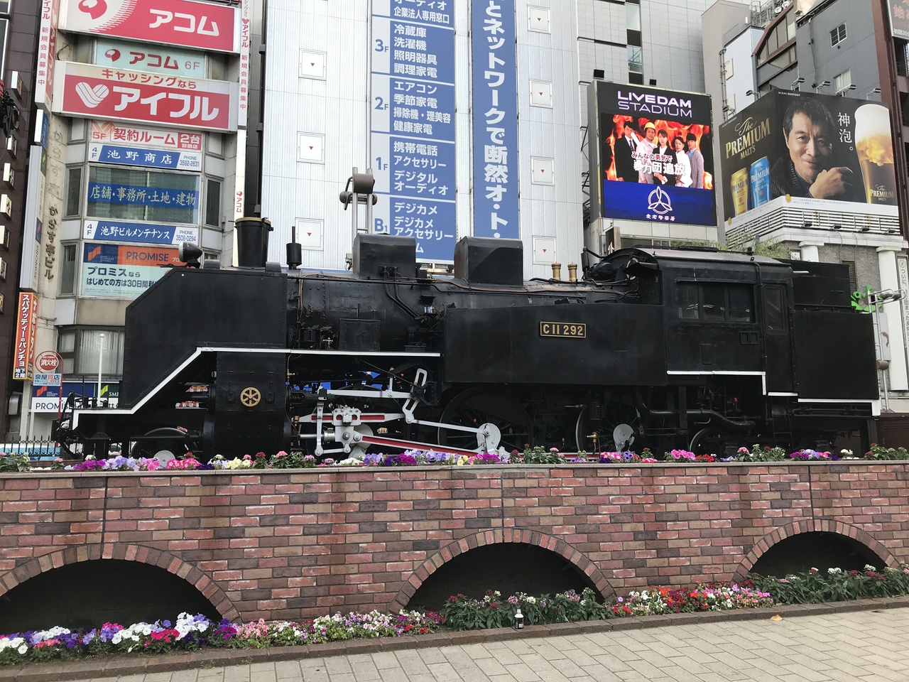 JR新橋駅日比谷改札口前の広場。目の前にドーンとSLが現れます。こちらではよく酔ったサラリーマンなどが街灯インタビューを受けていますね。新橋はそんなサラリーマンの聖地と言った感じでしょうか。