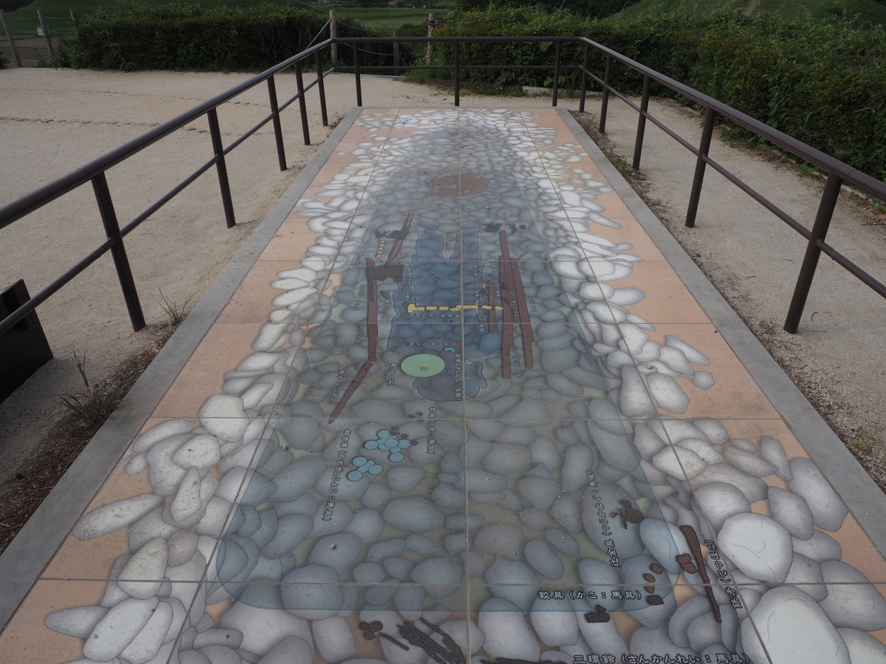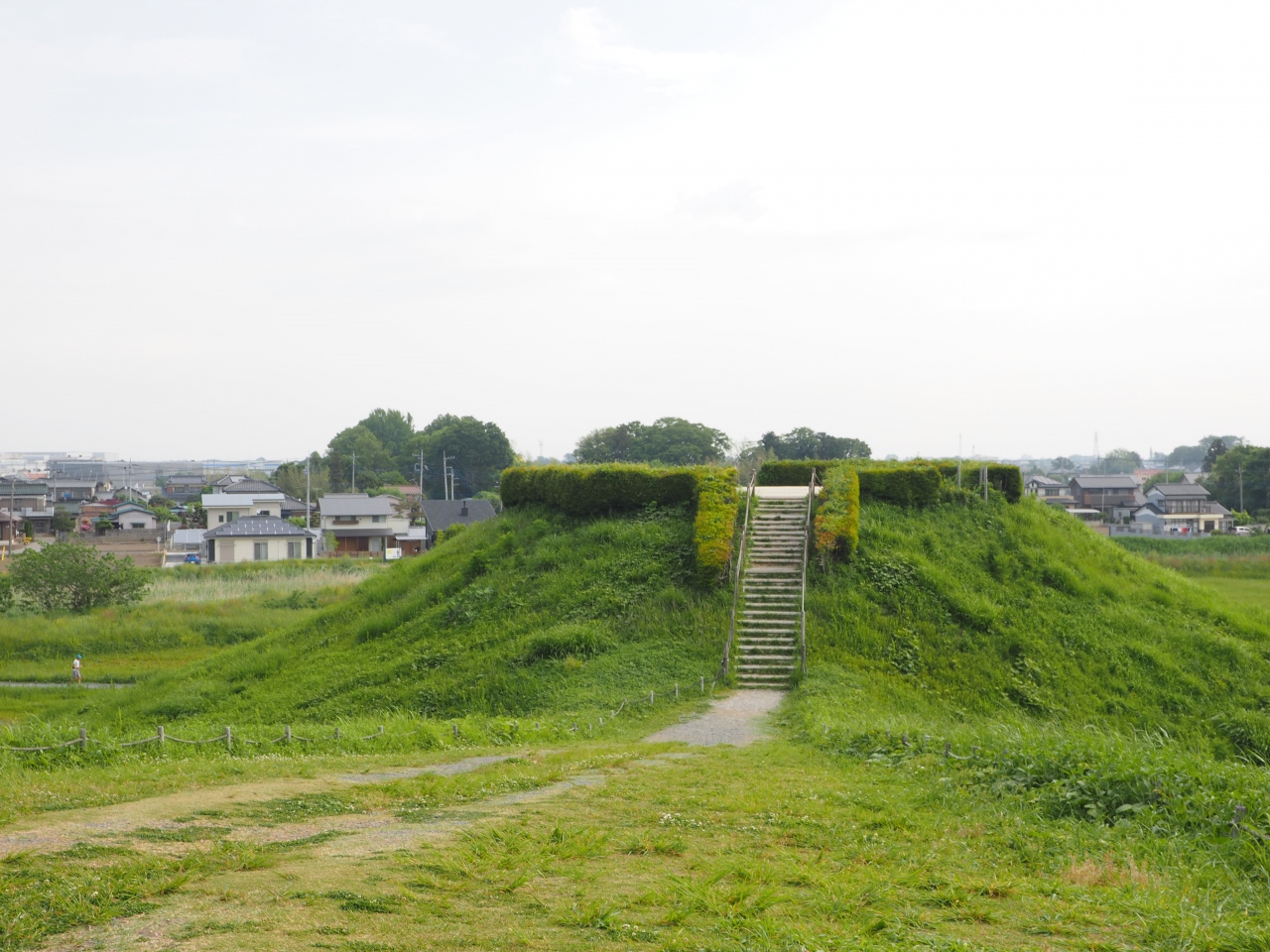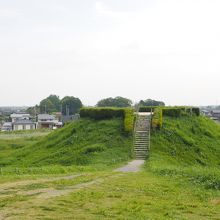 さきたま古墳群のなかで5世紀後半に造られた長さが120mほどの前方後円墳で、古墳に上ることができます。戦前に近くの沼の干拓工事を行った際に、前方部分を埋め立て用の土を採取するために取り壊されてしまったそうで平成15年に復元され元の姿に戻ったそうです。ここからは国宝にも指定された金錯銘鉄剣という剣が発掘されているそうです。