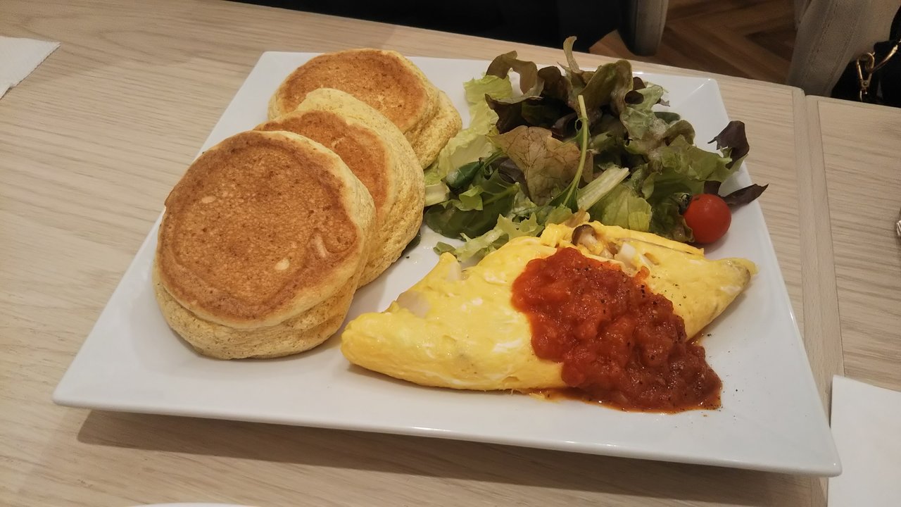 食感はふわふわでスフレのようで一皿に3枚も乗っているので少食の友人は苦しいと言っていました。