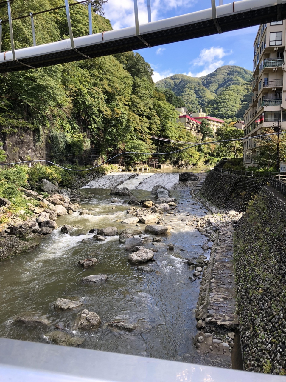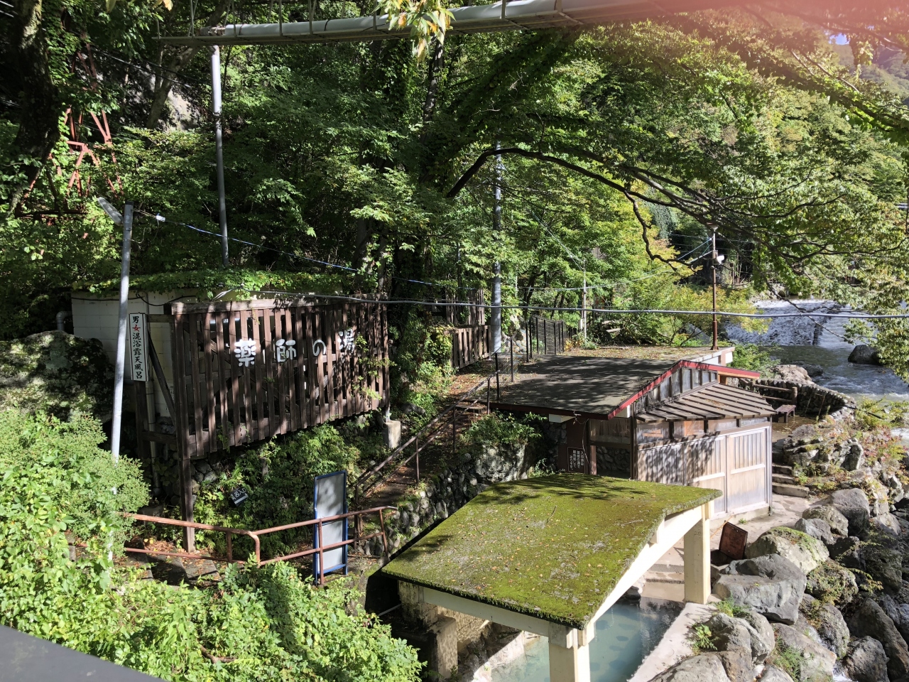 川治温泉に男鹿川に沿ったホテル裏の散策路を歩くと橋が出てきて、川下には川治温泉郷が続いています。橋を渡ると川治温泉「薬師の湯」があります。
