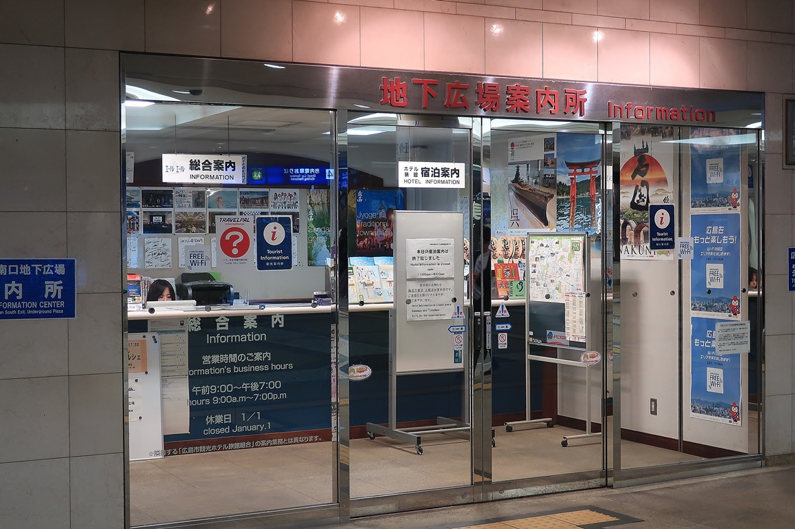 広島駅南口地下広場はJR広島駅から駅前方面へ向かう歩行者通路であるとともに、イベント会場となっている。大型スクリーンがあり、時折、催事をやっているのを見かける。そのホールの横にあるのが、この案内所だ。観光案内をはじめとする総合案内を行っており、広島市観光ホテル旅館組合に加盟する市内の宿泊施設の案内、空室状況の問い合わせも可能という。