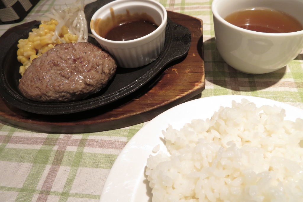 ランチメニューが4種あり、手ごねハンバーグ定食を注文(980円税込)。スープバーがセットで飲み放題となっていました。サラダバーは別料金で税別380円プラスすれば利用できます。キッズメニューもあり、アンパンマンの皿に入って500円でした(おもちゃなし)。
