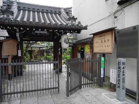 朝食の為三条の小川珈琲へ向かう途中、木屋町通りを歩いていると右側に小さなお寺を見つけました。門前には豊臣秀次のお墓との石碑が建てられているように、高瀬川の開削工事中ここから「秀次悪逆塚」と刻まれた石碑が発見された、これは秀次と一族が処刑され三条河原に埋められた時に立てられた石碑だったそうです。石碑発見後供養の為この場所に建てられたお寺だそうです。