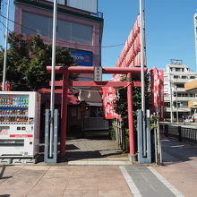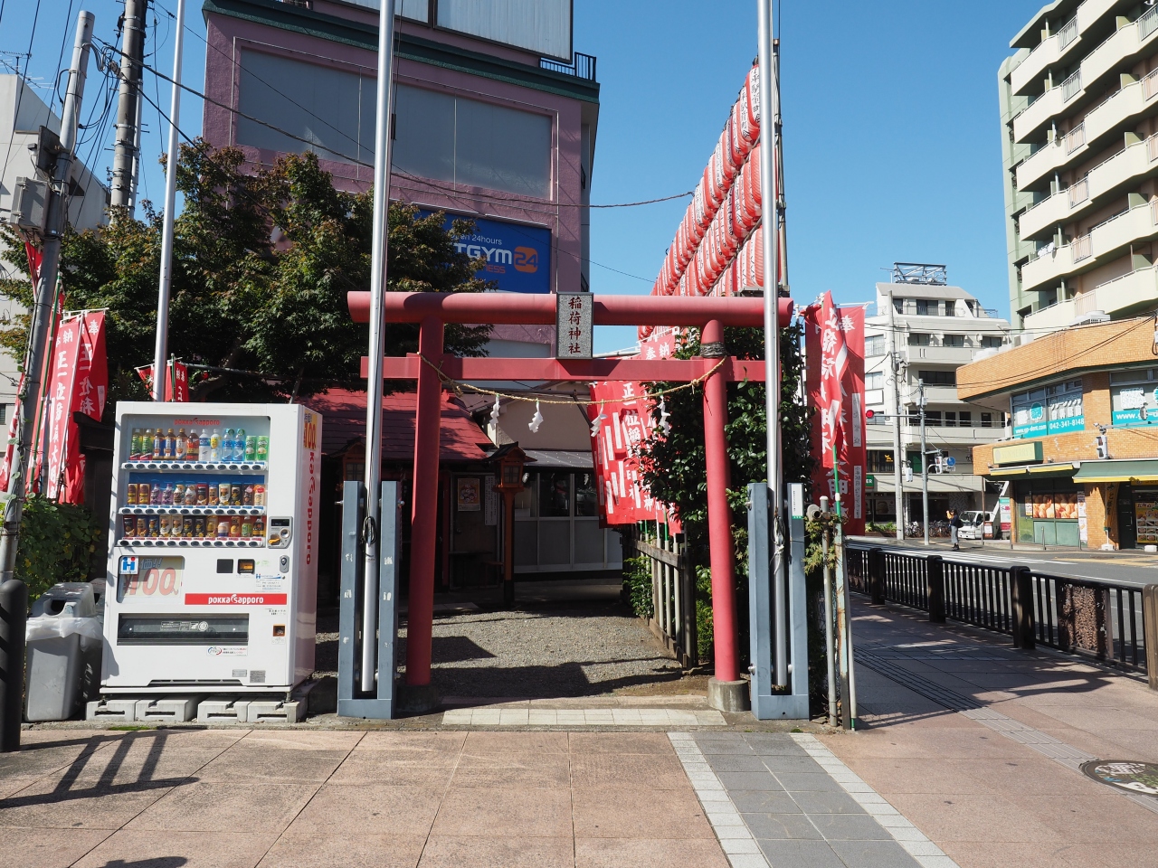 駅前のバスロータリーに面した一角にひっそりとある小さなお稲荷さんです。こじんまりとしていながらも赤い鳥居が綺麗に保たれ、複数ののぼりもひらめいていて、地元で大切に信仰されているのが伝わってきます。さっと立ち寄れる小ささなので、旅の途中にご挨拶をさせていただきました。