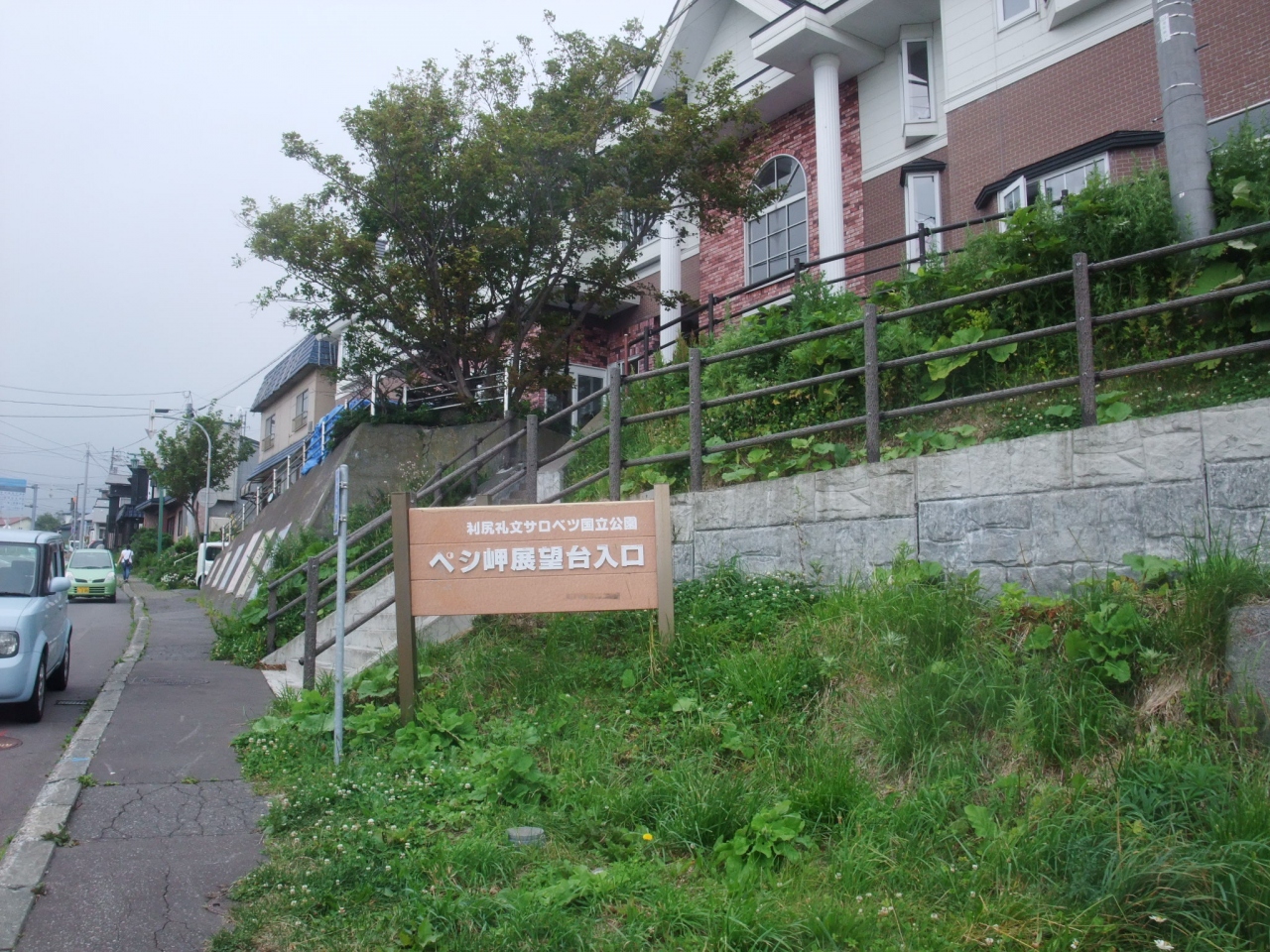 ペシ岬に登りに行ぅた。ペシ岬展望台入口は標識があったのですぐわかったが、人の家に入り込みそうなところにあった。