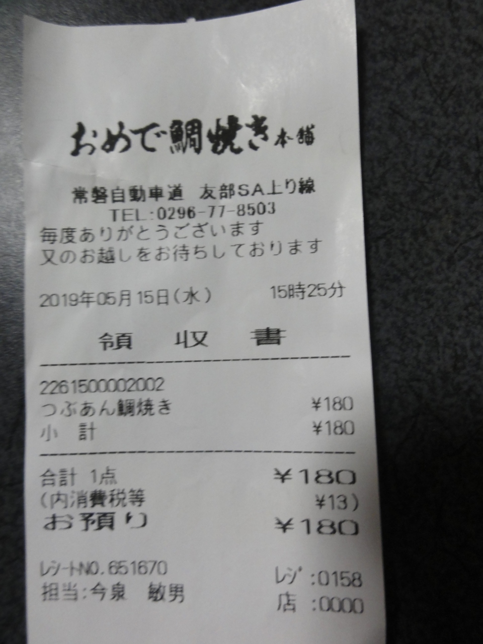 常磐道利用の帰路に立ち寄る友部SA、気がつくと買ってるのが鯛焼きです。写真取るのも忘れ食べましたが昇運の文字が入ってたのですね。それで「おめで鯛焼き」とは見事なネーミングです。新しい味もありますが、定番のつぶあんに疲れを癒やされてます。程よい皮の厚さ、甘さです。
