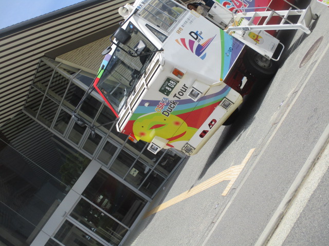 天満橋駅から少し行ったところに、川の駅「はちけんや」があります。ここでチケットを購入して、すぐ横から水陸両用バスが出ます。おそらく大阪ならではの乗り物です。外見もド派手で、出発のときは大きな歓声があがってとても盛り上がります。