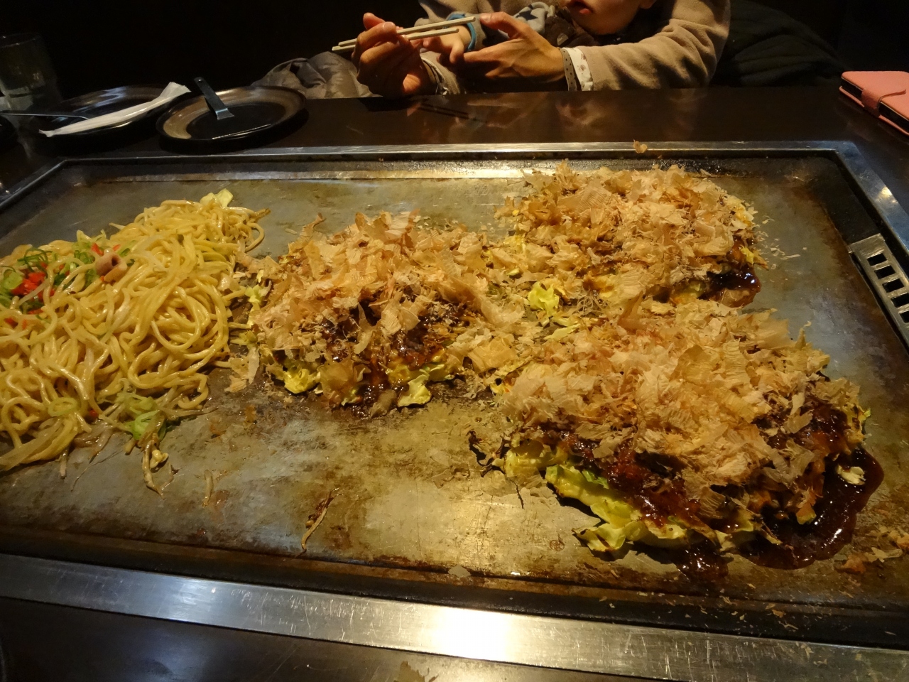 厨房の鉄板で焼かれたものが、テーブルの鉄板の上に運ばれてくるので自分で作ることはありません。目の前でソースをかけてくれますが、言わないとたっぷり過ぎて辛くなるので、「ソース少な目で」というと、少なくはなく、ちょうどの量になりました。