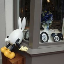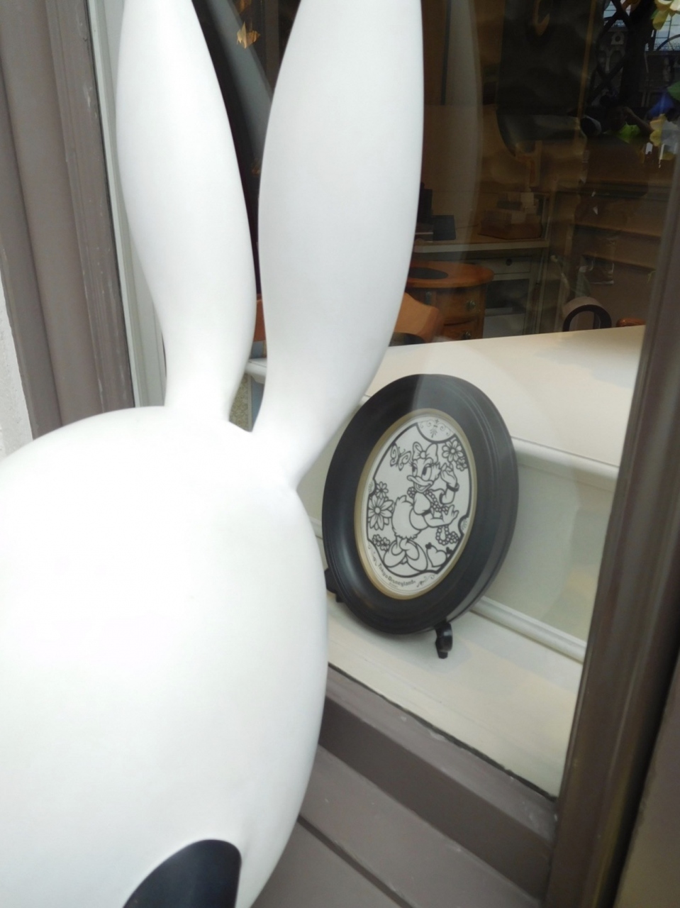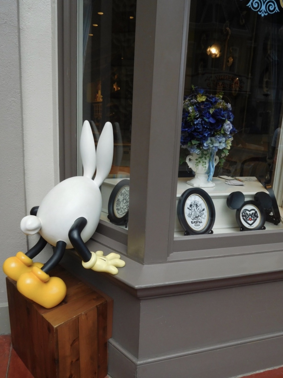 ところが今回、イースターイベント期間中ということもあり、ランドのイースターキャラでもあるうさたまが園内のいたるところに出没しており、そのうちの1体がこのシルエットスタジオのウィンドウをのぞき込んでいました。