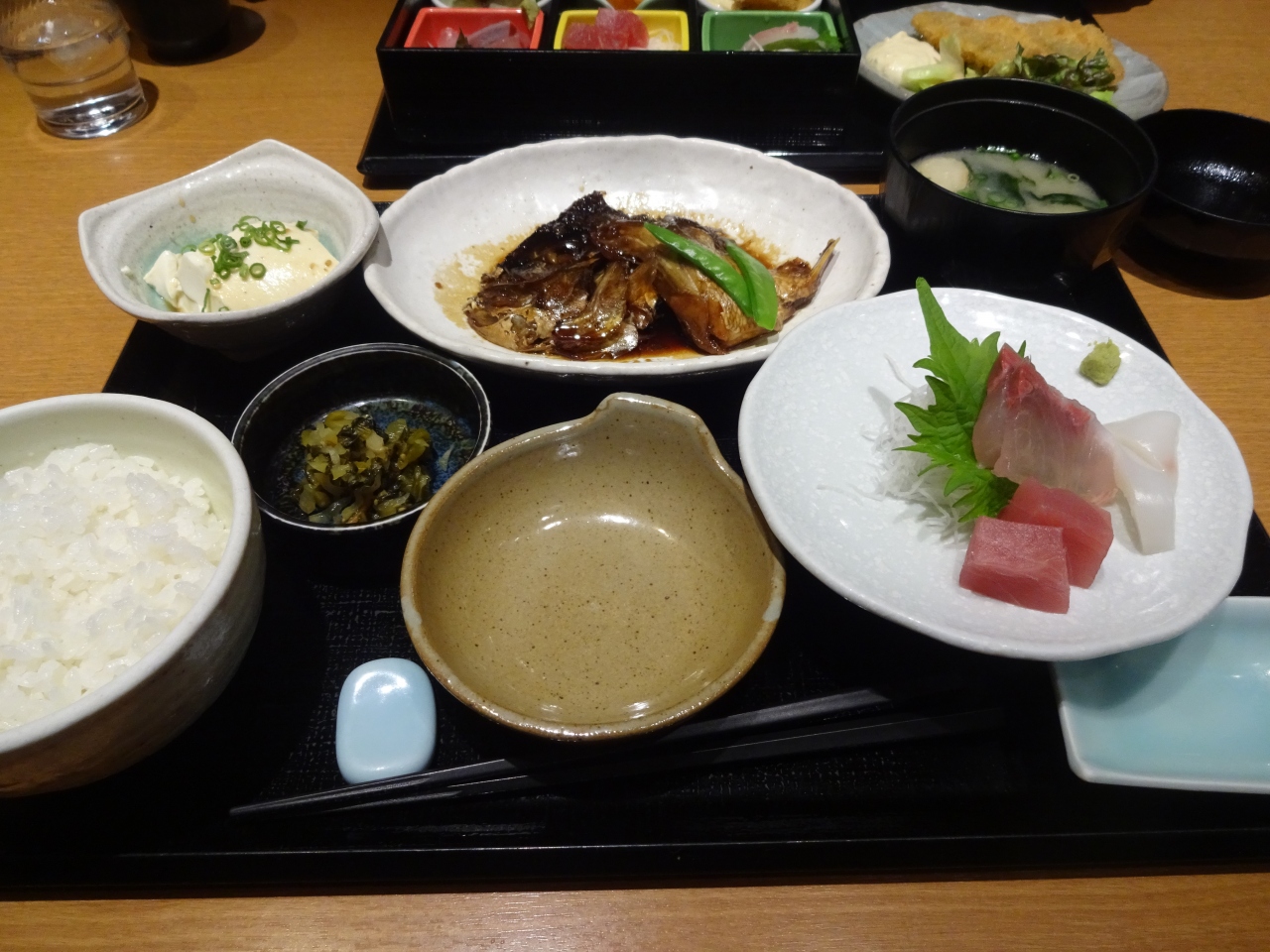 鯛のあら煮がメインで他にお刺身とお豆腐の小鉢、とけ物、汁とご飯。
