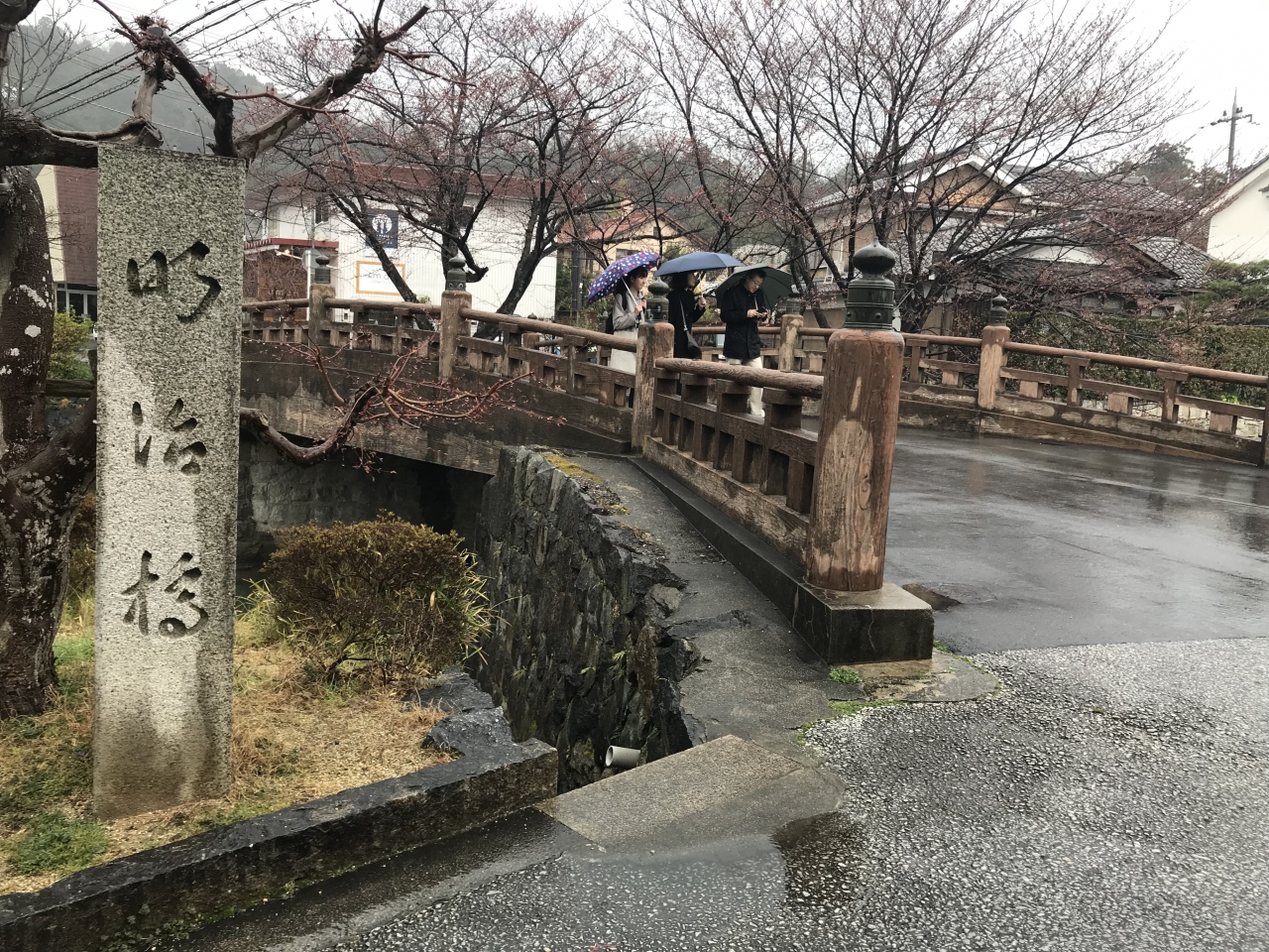 親柱や欄干など木目が付けられていて、和の雰囲気が漂っています。町の雰囲気になじんでいる橋です。明治橋の周辺には桜の木が植えられていて、つぼみが膨らんでいる状態だった。訪問した時は残念な天気だったけど、桜が満開の時なら素晴らしい景色になりそう。