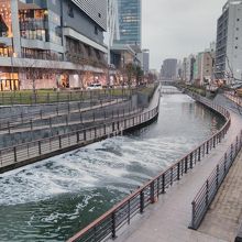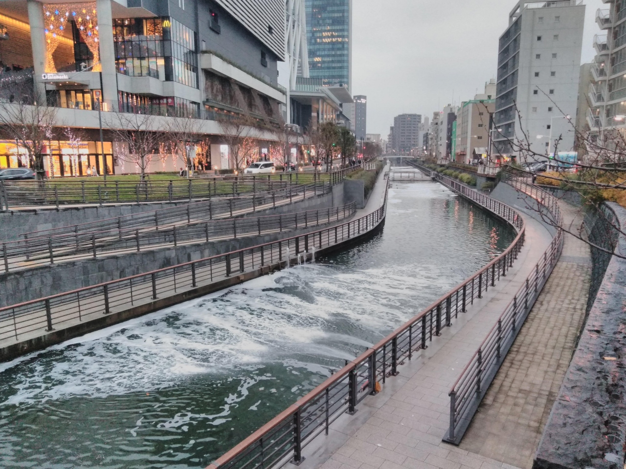 おしなり公園は、東京スカイツリーの南側に広がる浄化された川が広がっている快適な公園です。ほぼ真下から東京スカイツリーを望めるため、徒歩での散策が超おすすめです。この距離だと東京スカイツリーの全景が1枚の写真にかろうじて収められます。
