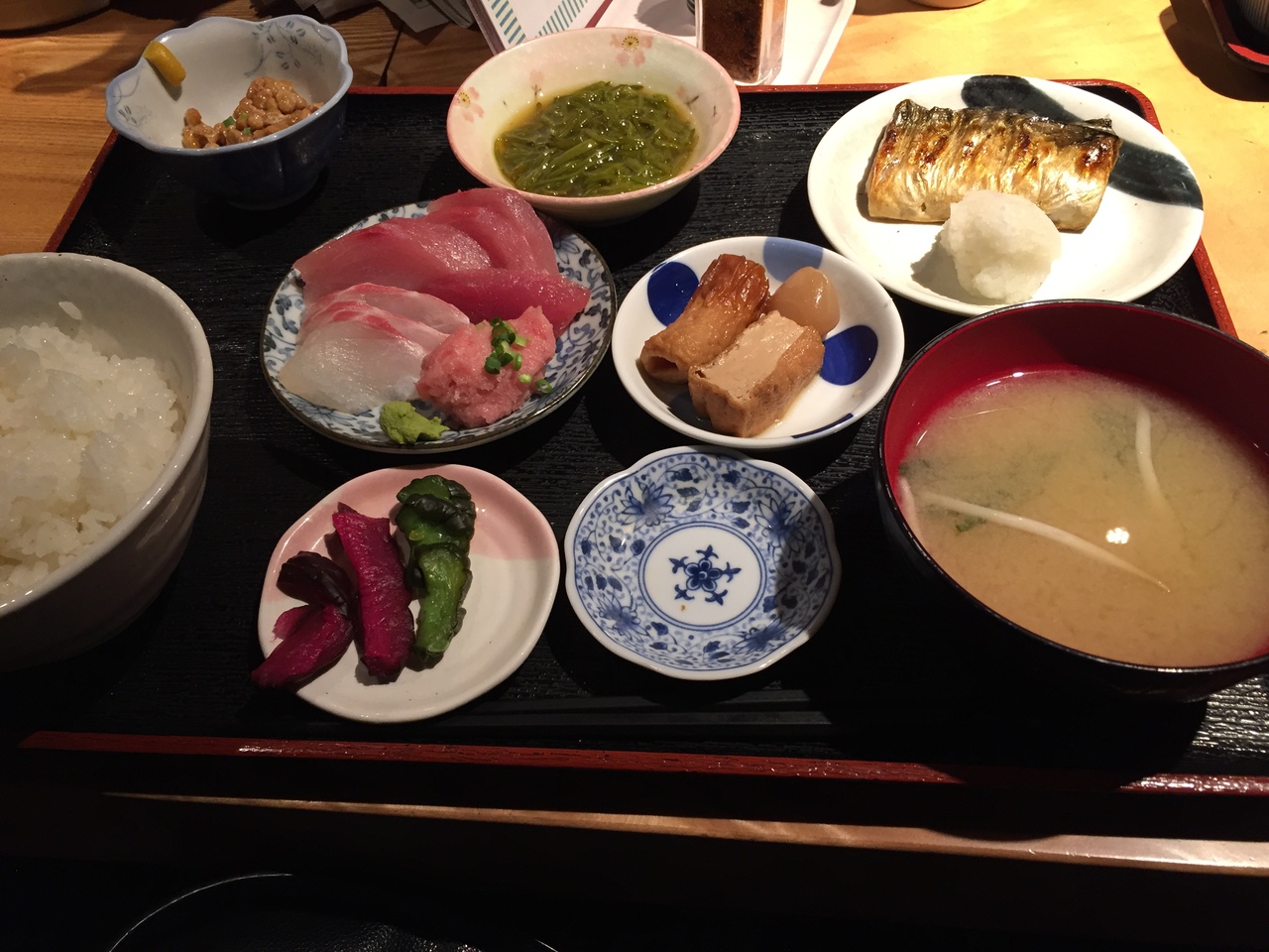 六本木一丁目周辺のレストランにランチで色々行ったけど、一番のお気に入りは笑壷ランチ!1100円でお魚はサバ、アジ、サーモンなどから選べて、さらに二品、納豆、だし巻き玉子、冷奴、めかぶなどから選べます。お刺身、味噌汁、おでん、ご飯、お新香がついてヘルシーで大満足です。