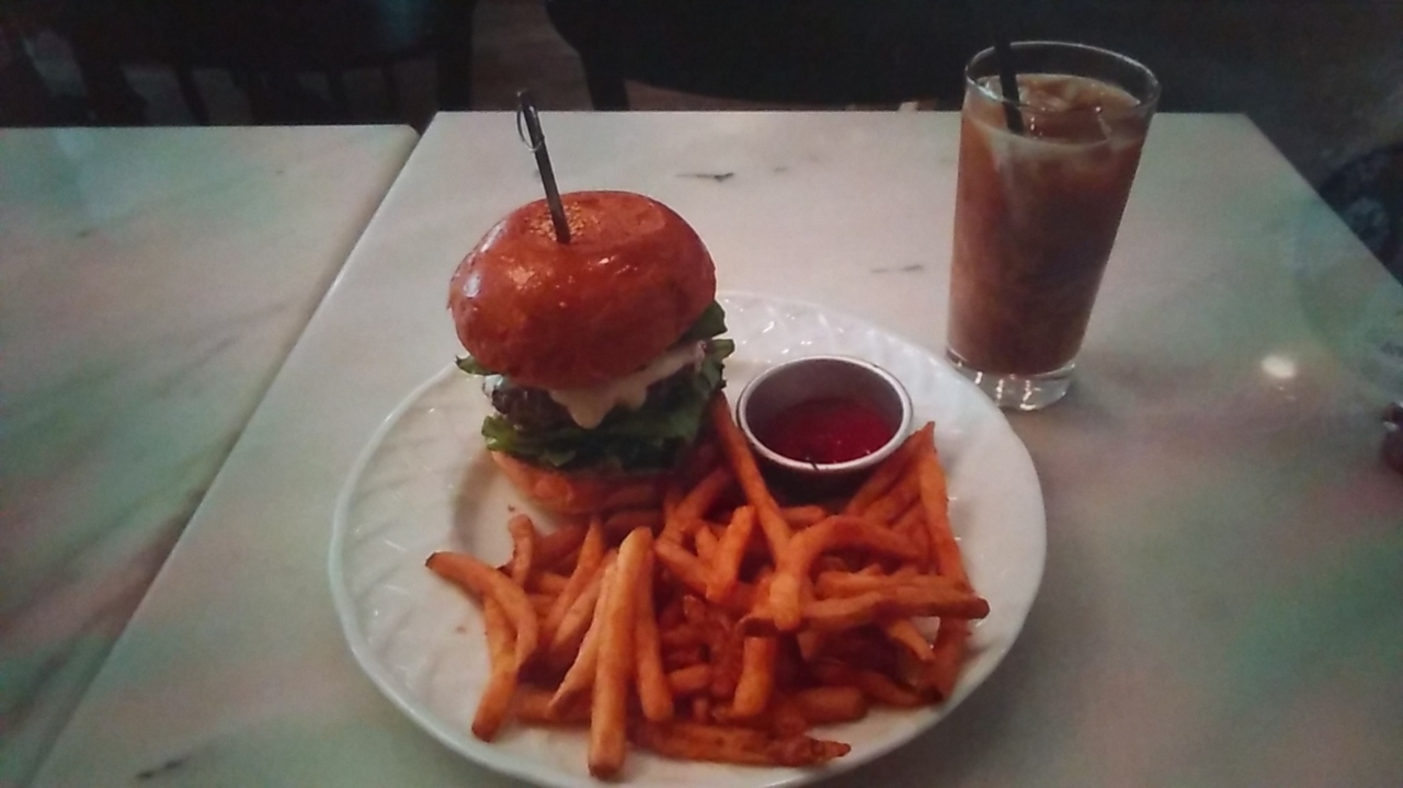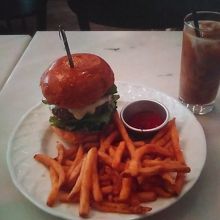 モッツァレラとルッコラのアボカドグリーンバーガー、フレンチフライ、アイスコーヒーを注文