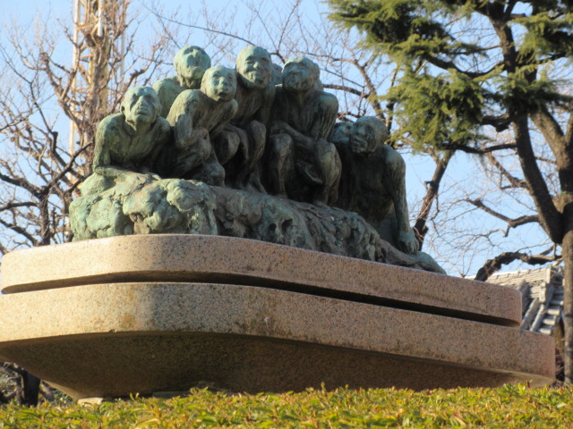浅草の浅草寺の参拝に行きました。本殿向かって。左手あたりに銅像があります。もともとはここに噴水があったそうで、植え込みの中央にある銅像なのですが、とても不思議な銅像で、遠目では猿っぽいものがたくさんにらんでいる雰囲気。近づいてみるとどうやら雲に乗った大勢の人々がたくさんいることがわかります。彫刻の有名作家の作品ですし、迫力ある表情なので一見の価値ありですが、あまり気づかれていなく残念です。