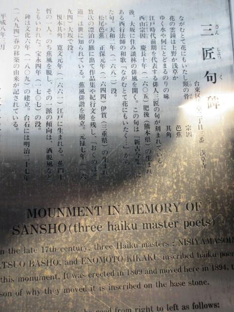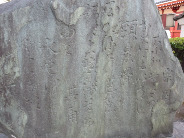 浅草の浅草寺の境内、新奥山のあたりにある石碑でした。宗因・芭蕉・其角という、超有名な俳諧の人々の俳句が刻まれている石碑でした。江戸にかかわる彼らの俳句を一堂に集めた石碑なのですね。静かな場所にあってあまり人はいなかったけど、素敵な石碑だと思います。