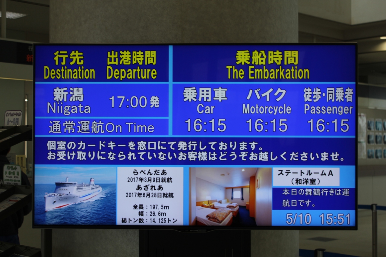 フェリーターミナルは大きな建物で、1階に受付、2階に売店、レストラン、待合室があり、車以外の方は3階から船へ乗船します。