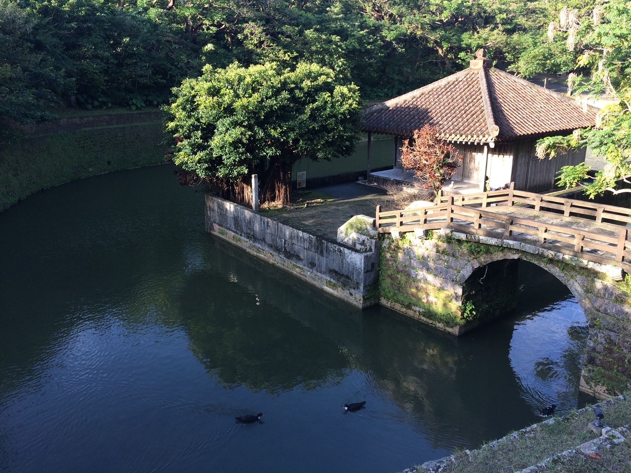日本庭園のような雰囲気と中華な雰囲気が混在した風景です。天女橋という石造アーチ橋が、池にかかっています。国の重要文化財に指定されています。首里城の敷地に入る手前にあります。日本百名橋の1つでもあります。絵画スケッチをしている人がいました。