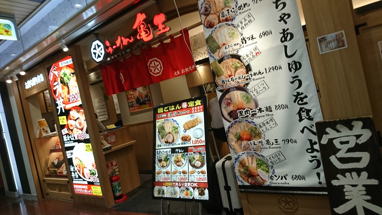 新大阪駅の二階にあるラーメンのチェーン店。少し場所が外れているが人気はある。おすすめは亀王ラーメン。オーソドックスな長浜ラーメン風で個人的には好き。替え玉も可能だ。