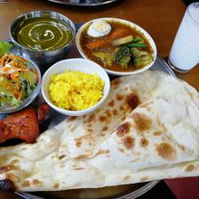 ホウレンソウベースのチキンサグカレーとチキンレッグのスープカレーにサフランライスと大きなナン、タンドリーチキン、サラダにドリンクが付いたボリューム満点のセットでした。