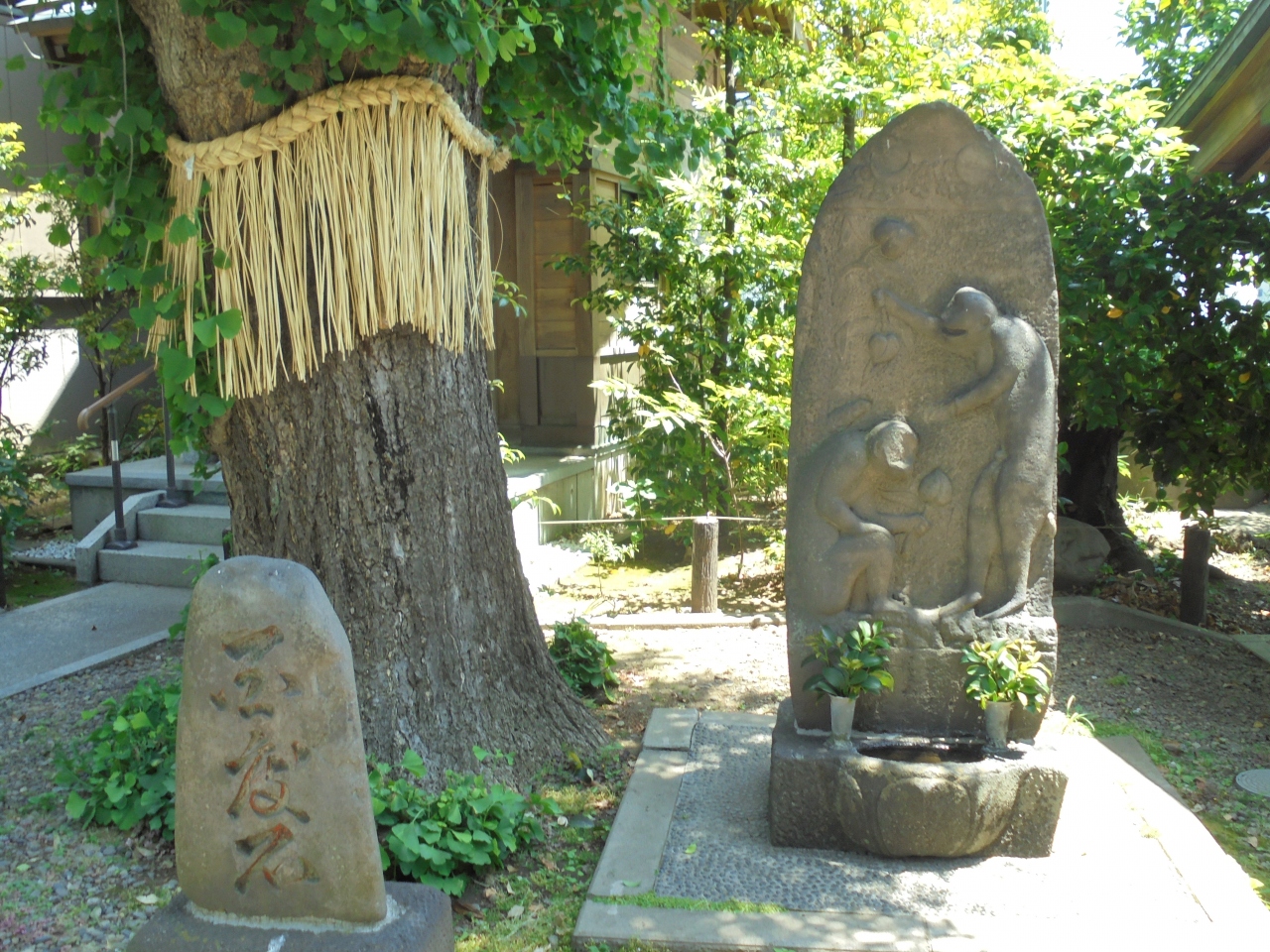 また階段を上った右側には、寛文4年(1664年)に奉納されたという「庚申塔」が佇んでいます。こちらは二猿と桃の木、桃の実が描かれた珍しい構図とのこと。