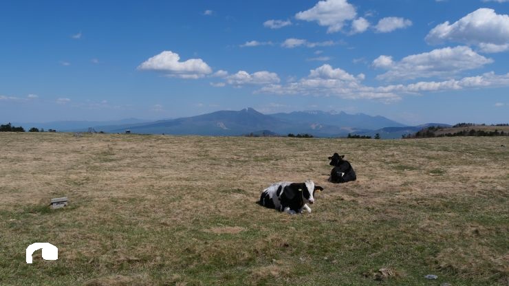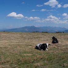 峠道を登っていくと、広大な牧場風景をみることができる。百名山としては最高峰の王ヶ頭で標高2034メートルで他にも王ヶ鼻、牛伏山、武石峰といったピークがある。