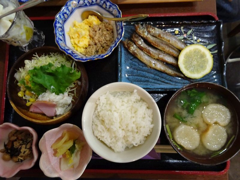 行った日の和膳はししゃも。写真の料理に飲み物も付いて660円です。ご飯もお替り無料。すばらしい。