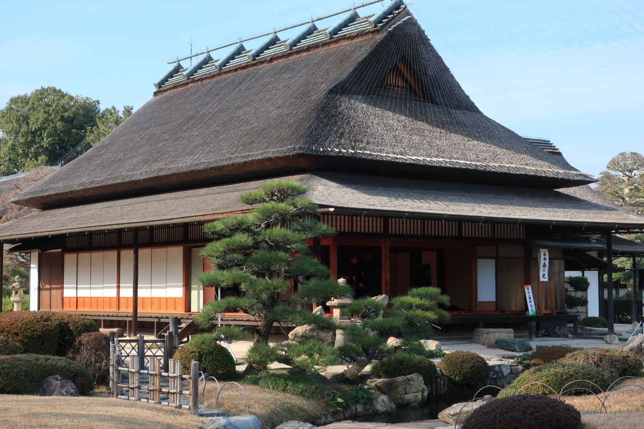 正面入り口から入ると右側に見える建物群の一つだ。藩主の居間であり、賓客をもてなした建物で、ここから見る風景を中心に池泉回遊式の庭園が築かれている。1945年の岡山大空襲で焼失し、1960年に再建されたが、第一級の木材と技術で築庭当時の間取りに復元したという。また、借景を保全するため、市の景観条例もある。上がることはできないので「殿様の景色」は堪能できないが、ここから見る風景が園内の基準なのだ。