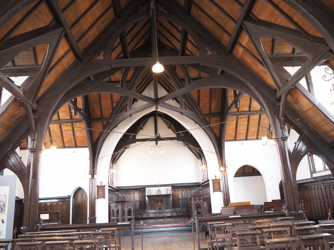 明治村5丁目にある、ザビエル天主堂や聖パウロ教会堂よりも和の雰囲気が漂う教会。木造なので、教会として以外にもいろいろ使えそうな建物。2階部分が礼拝堂になっていて、1階部分が小学生用の机や椅子などが置いてある。日曜学校や幼稚園として使われていたらしい。明治に使われていたのか、現代の観光客のためか知らないけど、木製の電車のレールがあって、今も子供が楽しめそうな雰囲気。ただ、埃っぽい。