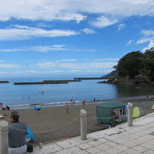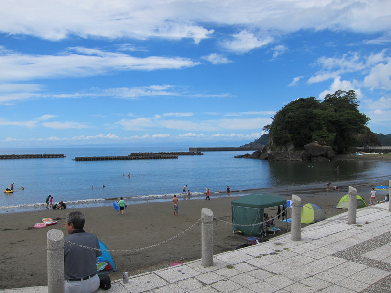 西伊豆松崎のいくつかある海水浴場の中で全長が長く、とても広い砂浜の海岸です。水の透明度は西伊豆のさらに南にある海水浴場ほどはないにしてもきれいで、遠浅で安心して楽しめる海水浴場です。伊東園松崎ホテルの前あたりは賑わいますが、全体的にはゆったりとしています。