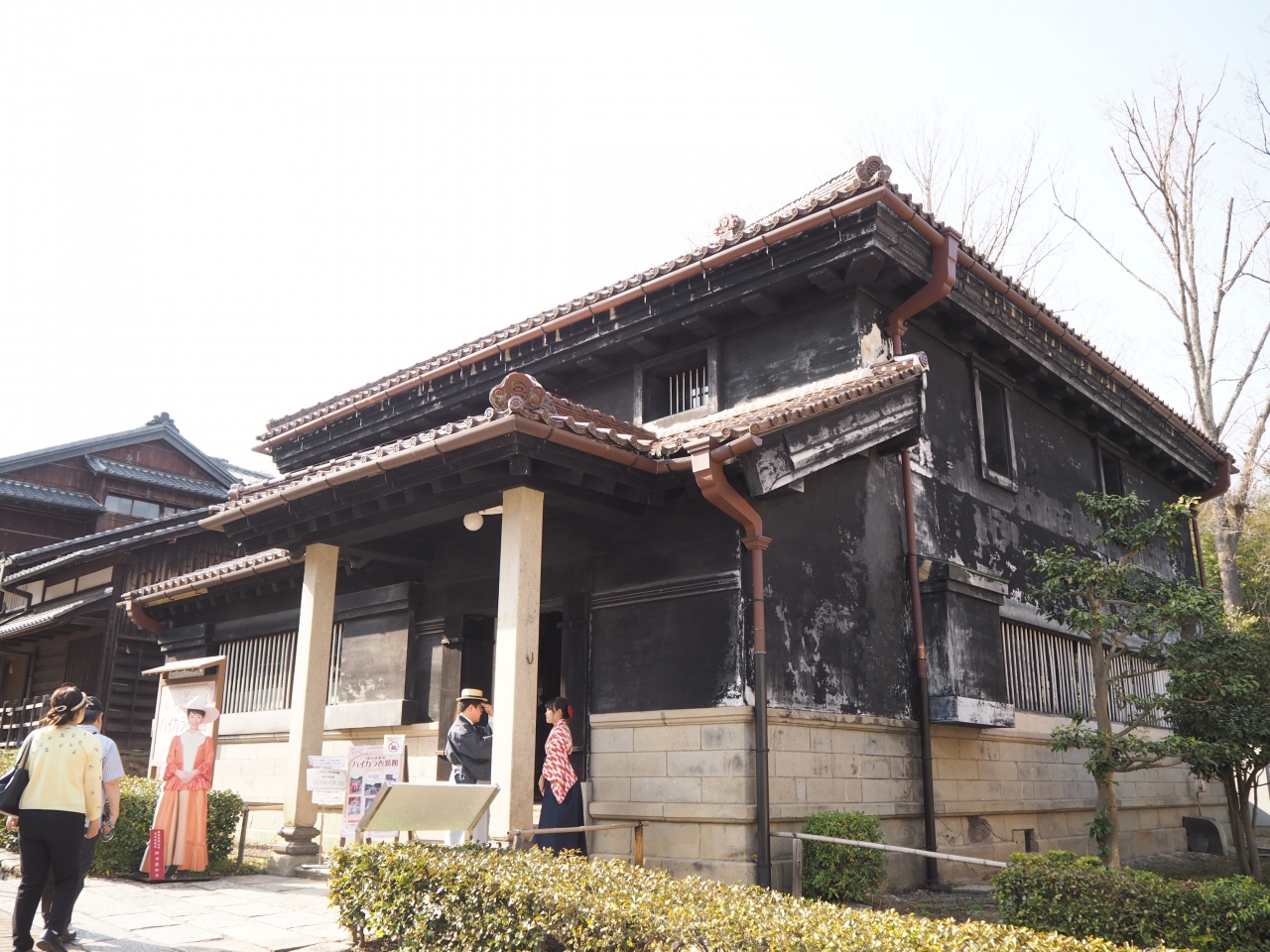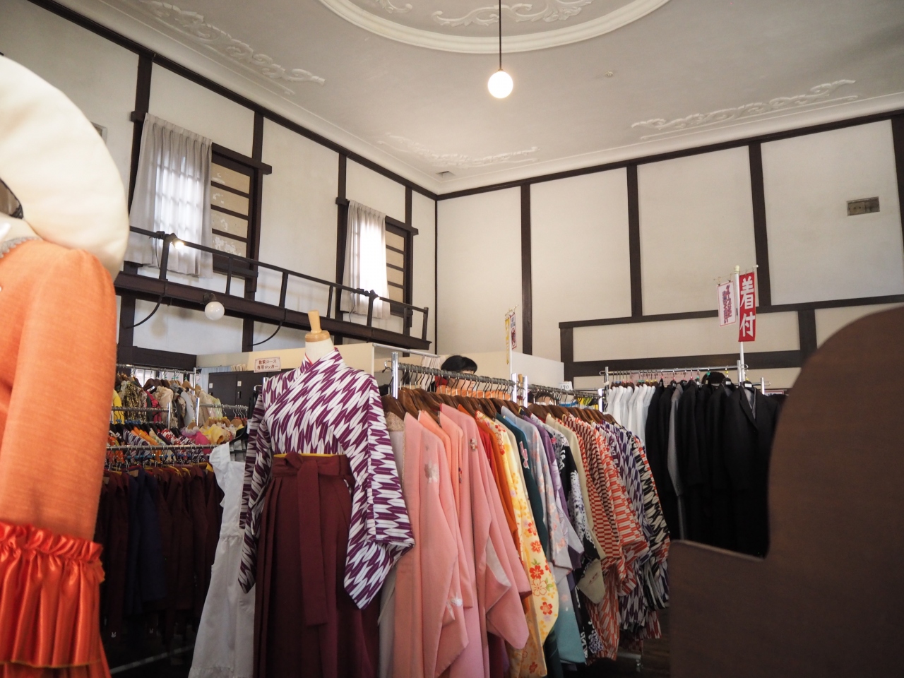 ハイカラ衣装館の看板と共に阿川佐和子村長のパネルが入口に置かれている。中に入ると、銀行の名残であるカウンターの窓口がある。カウンターの内側にはレンタル衣装が沢山並べられてる。袴とか西洋ドレスとか、女性用だけでなく、男性用の袴とかスーツとか種類が豊富。撮影を思い切り楽しみたければ、ここで仮装するのもありなのかも。