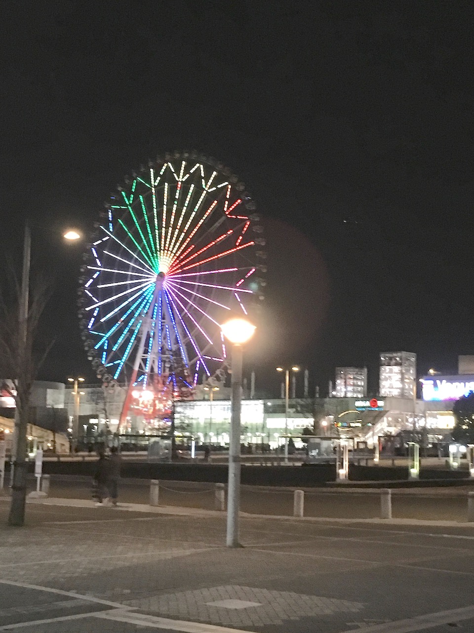 パレットタウンの観覧車が、夜空をバックに虹色にライトアップされていて綺麗でした。