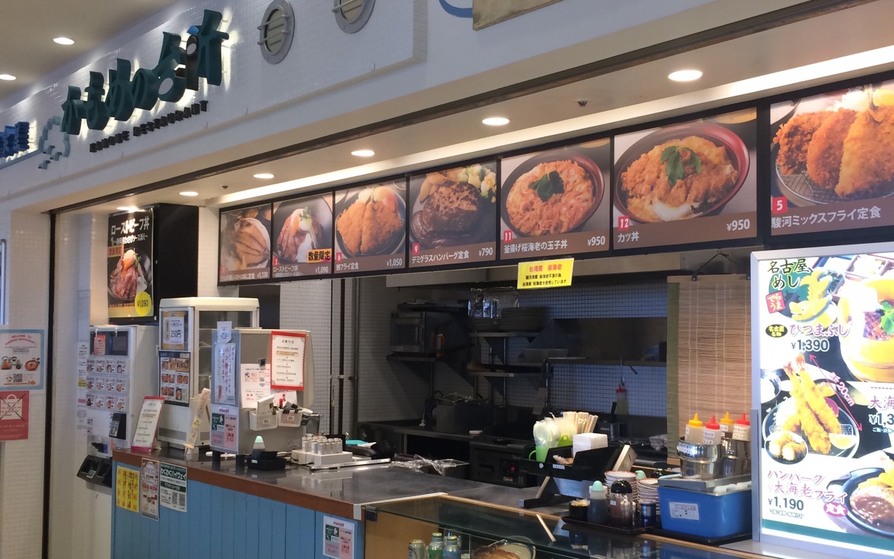 新東名高速道路の駿河湾沼津サービスエリアにあるお店。カツどん、ミックスフライ、ハンバーグなど洋食が並びます。最初に券売機で券を買ってから、スタッフの人に渡して、呼び出しベルをもらいます。ひつまぶしがあったので迷いましたが、1500円くらいするので諦めました。