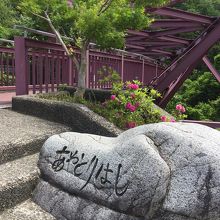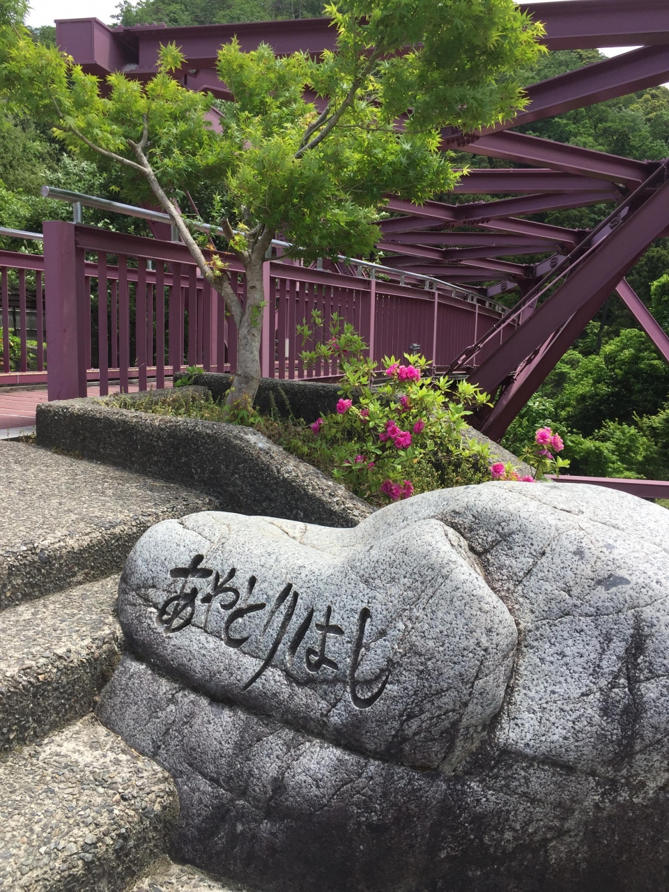 この橋を渡り下りていくと鶴仙渓へ出るようになっています、鉄骨ですが、赤紫いろの綺麗な橋で、気にならない程度揺れは有りますが、子供でも大丈夫でした、橋の手前に無料のパーキングとトイレが有りました、この場所はバリアフリーでは有りません。