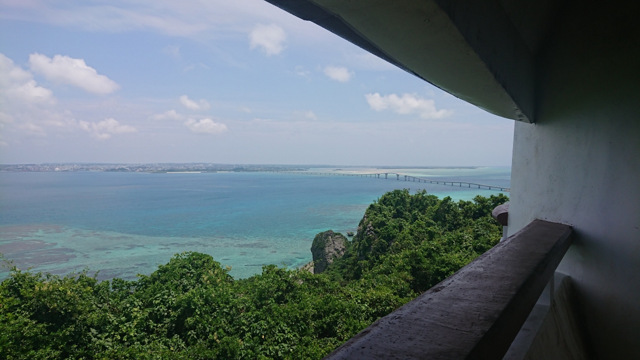 伊良部大橋を車で渡った後、牧山公園の展望台へ行ってみました。駐車場から展望台までまっすぐな歩道が続いていて、蒸し暑い中、ちょっとためらいましたが、行ってよかったです。海も橋も空も森も美しい。絶景が待っています。