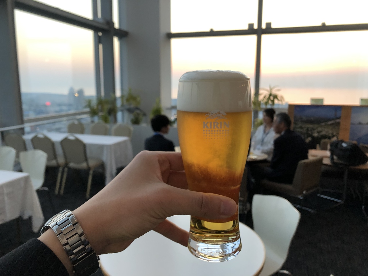 仕事終わりに訪れた朱鷺メッセの展望台で、カフェがあったので少しくつろぐことにしました。日本海に進みゆく最高の夕日を眺めながらのビールです。安くはないですが晴れていたこととPayPayが使えたことで笑、利用しました。夕焼けはすぐに夜景に変わり、美しい薄暮の新潟の景色を眼下に生ビールを堪能しました。
