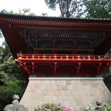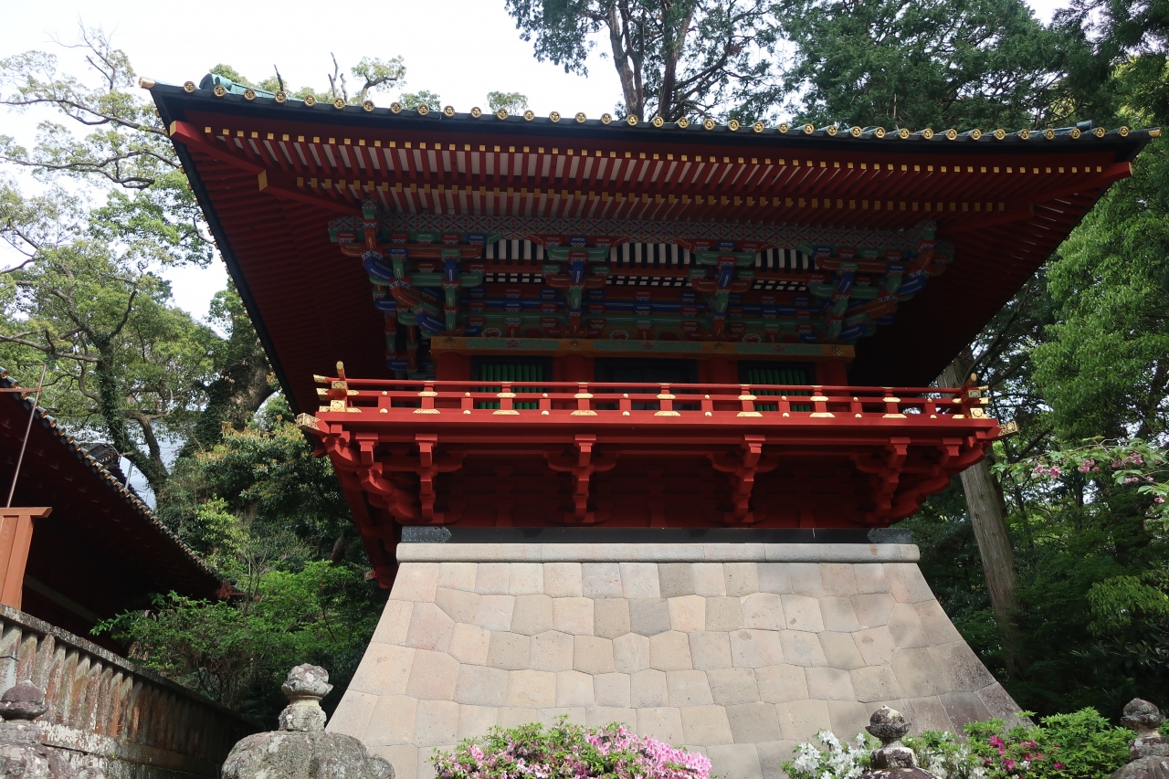 神厩から一段上がった右手にある高い建物が久能山東照宮 鼓楼です。石垣の上に作られた鼓楼は太鼓を設置するためのもので1617年に建てられました。もとは鐘を吊るす鐘楼だったのが、こちらも廃仏毀釈のあおりで鼓楼に改めたとのこと。こちらも朱に塗られ、特に軒のしたの梁には極彩色の塗装が施され、下から見上げるだけにとても見事に見えます。