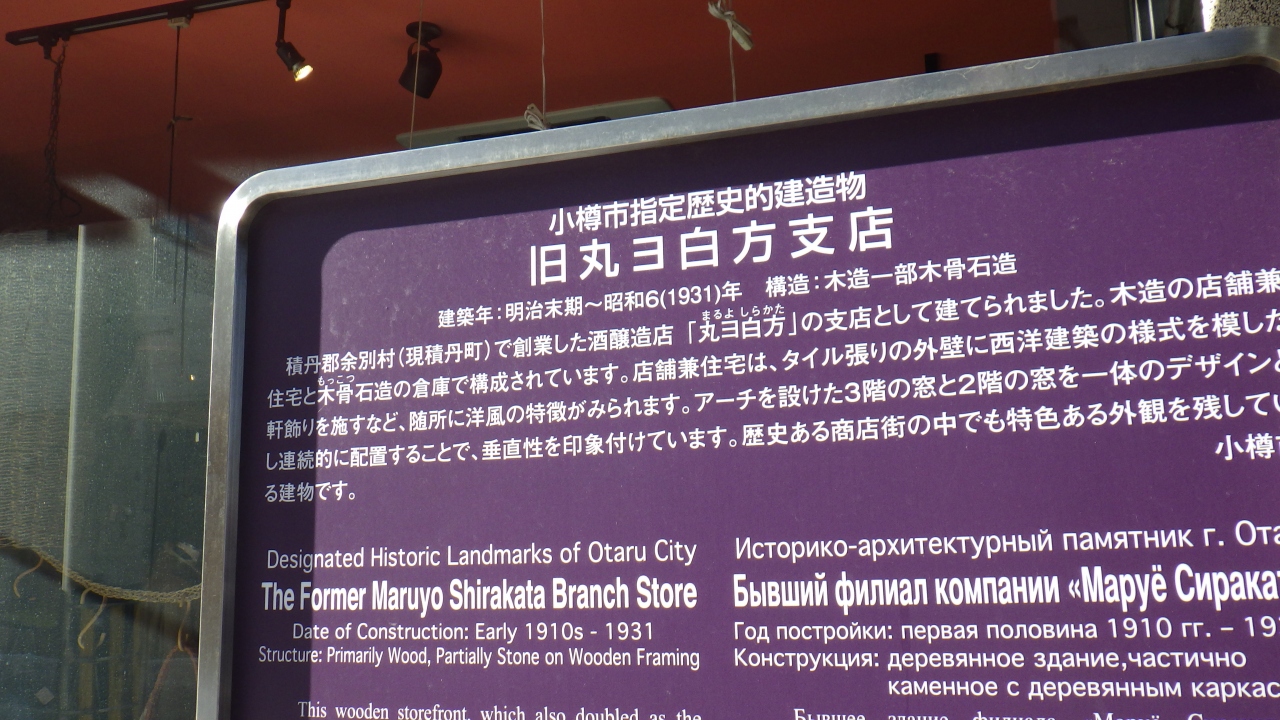 小樽市が設置した案内板によると、建築年数が明治末期から昭和6年とあり、木造タイル張りの店舗兼住宅と一部木骨小樽近郊で採れる軟石を使用した石造の倉庫で構成されていて、小樽市指定歴史的建造物に指定されている酒醸造店の支店として建てられた建造物です。
