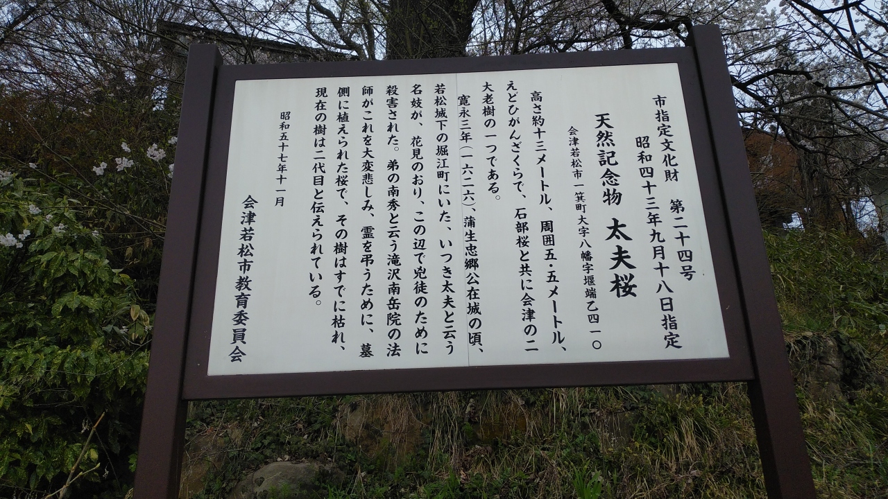 弟の南秀という滝沢南岳院の法師がこれを大変悲しみ、霊を弔うために、墓側に植えられた桜で、その樹はすでに枯れ、現在の樹は二代目と伝えられているそうです。今回の私達の東北旅行は各地で桜が満開でした。勿論、太夫桜も満開でしたが、通路の左斜面に咲いている為「太夫桜」を知らなければ素通りしますので、飯盛山のみどころで検索すると、飯盛山の案内図があるのでコピーして行くことをお勧めします。