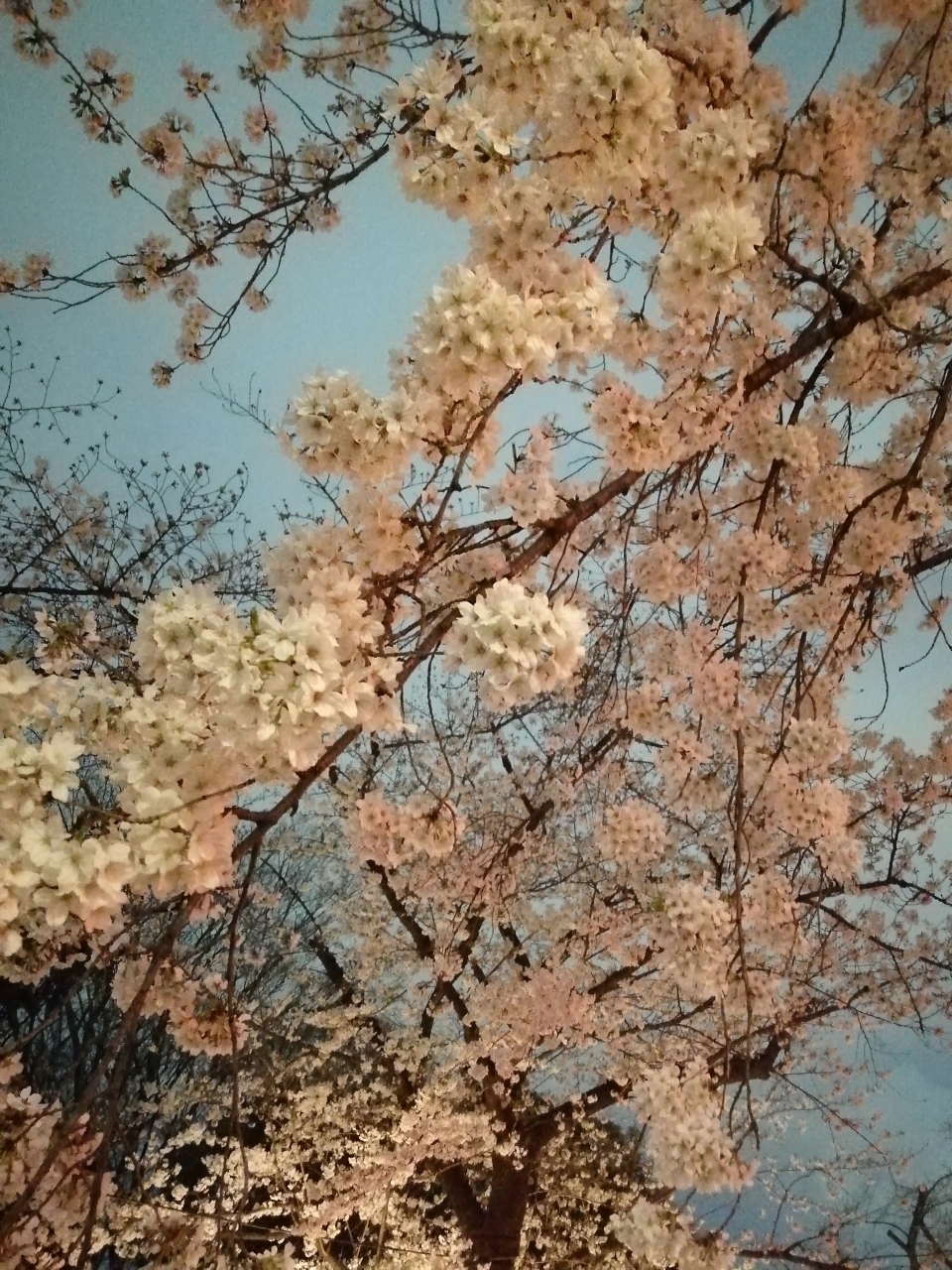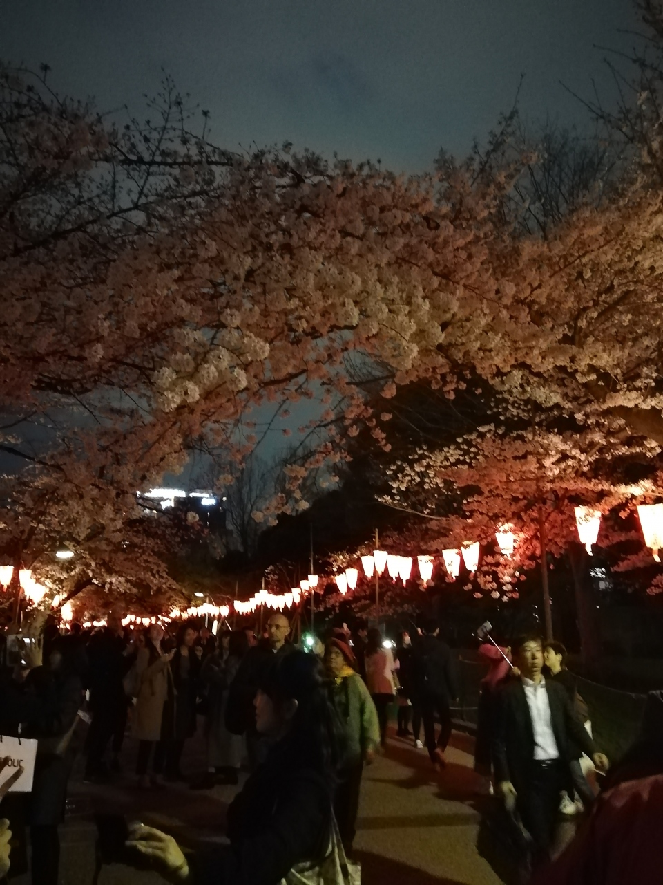 上野公園の夜桜を見に行きました。まだちょっと早かったみたいで6部咲き程度でした。しかしウワサ通りの人混みです。夜店もでており外国の方も含めてまっすぐあることが困難なほどの人混みでした。でも夜桜は綺麗です。