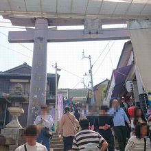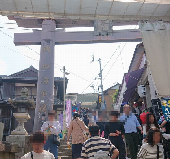 金刀比羅宮の参道を進み石段113段目にある立派な鳥居です。人混みの中、足元に気を付けながら歩いていると見過ごしてしまいそうです。その脇には備前焼の狛犬が鎮座していました。重要有形民俗文化財だそうです。確かに焼き物の狛犬は珍しいですね。
