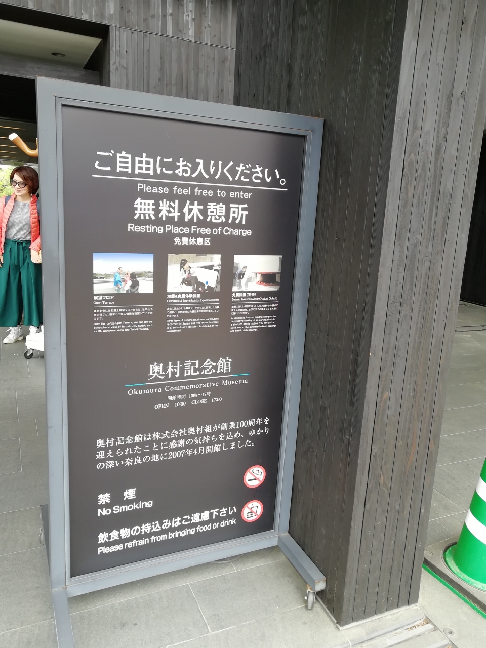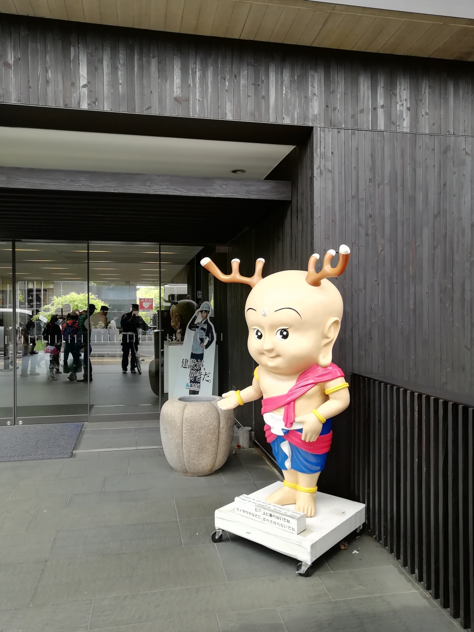 奈良観光で奈良公園界隈を回りました。GWでしたので、早朝7時すぎから駐車場は既に満車です。外国の方が多い。とても多い。バスが到着する度に人が増えていきます。奈良公園の中央に奈良国立博物館のお向かいに氷室神社の横あたりで公園のど真ん中です。夢風ひろばにもほど近い場所。無料で中に入って休憩ができます。暑い日でしたので涼しくて助かりました。でも人が多いです。セントくんが入り口にいるので写真スポットです。